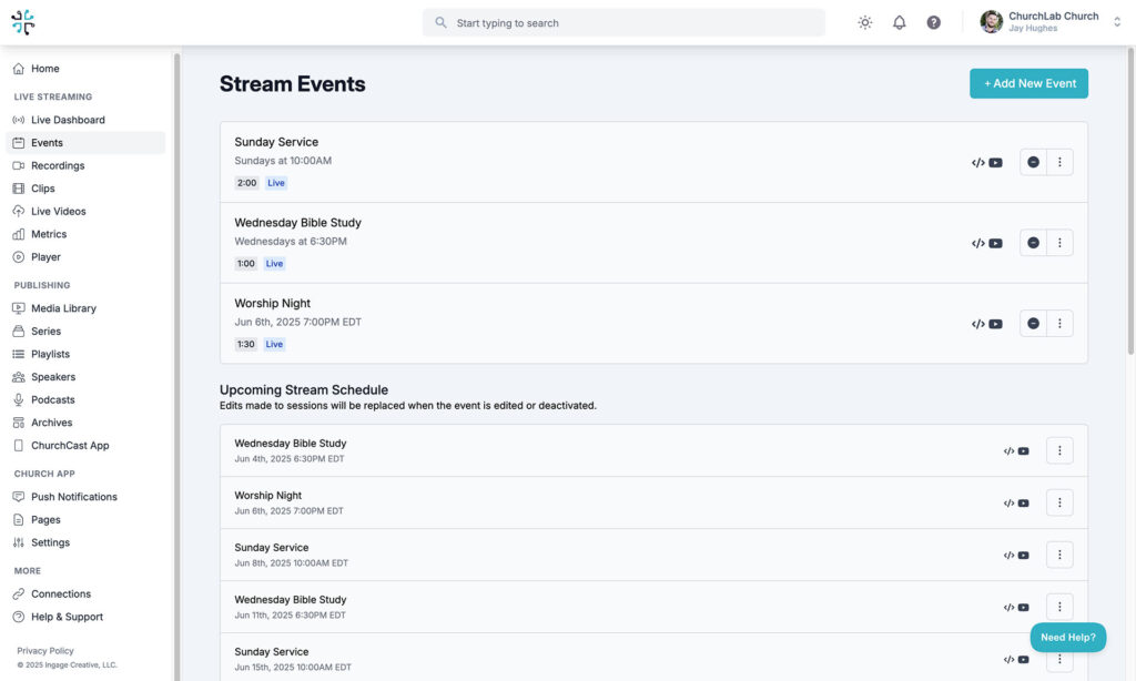 ChurchLab isn’t a conglomerate, driven by private equity, profits, and shareholder interests. Our platform is built by a former church media director, with the mission to provide churches with live streaming and publishing that saves time and helps you publish quicker – no matter what your budget.