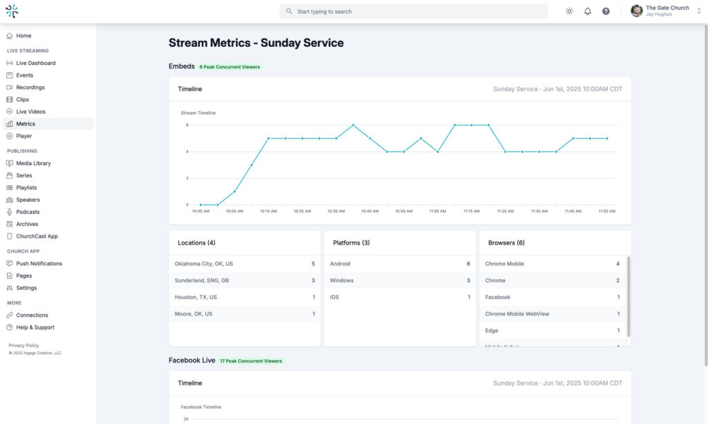 Keep track of your online viewership directly in the ChurchLab dashboard. Our platform measures your audience and shows you where your viewers are watching from. Facebook and YouTube stats are also available alongside detailed metrics from our embeds.